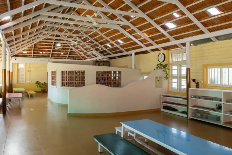 The newest addition came in the way of a Multi Purpose Hall and Dining Room perpendicular to the existing structure. We again reused most materials from the dismantled structure cutting down on the consumption while giving new use to the materials. This new block also houses the Children’s Toilet as well as a small Pantry for the Teaching Faculty. By adding this perpendicular wing to the existing structure, we were able to optimize space and create a couple of new working environments