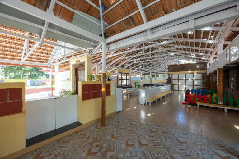 The building’s exterior and interior embrace earthy colors like soft yellow, green, brown, and off-white, creating a bright and welcoming atmosphere. These warm tones beautifully complement the colorful children’s furniture, enhancing the playfulness of the space. In the play area and garden, vibrant primary colors and whimsical characters add a sense of fun and imagination. This thoughtful color scheme not only promotes joy but also fosters creativity, making the environment perfect for children to explore and grow.